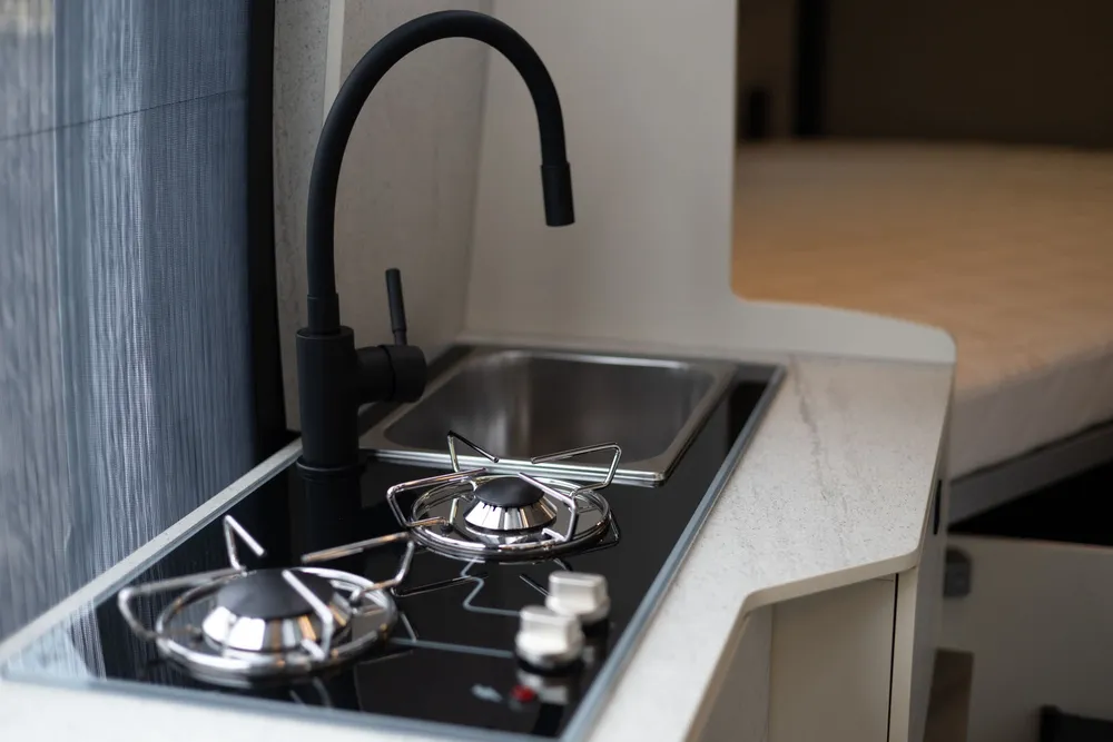 Mit dem OFF GRID NO GAS PACKAGE können Sie 100% elektrisch kochen. Es enthält die OFF GRID PLUS Ausstattung und ein doppeltes Induktionskochfeld mit je 800W Leistung – ganz ohne Gas.