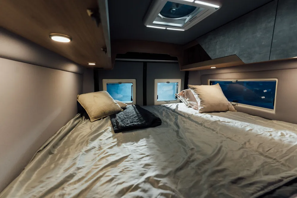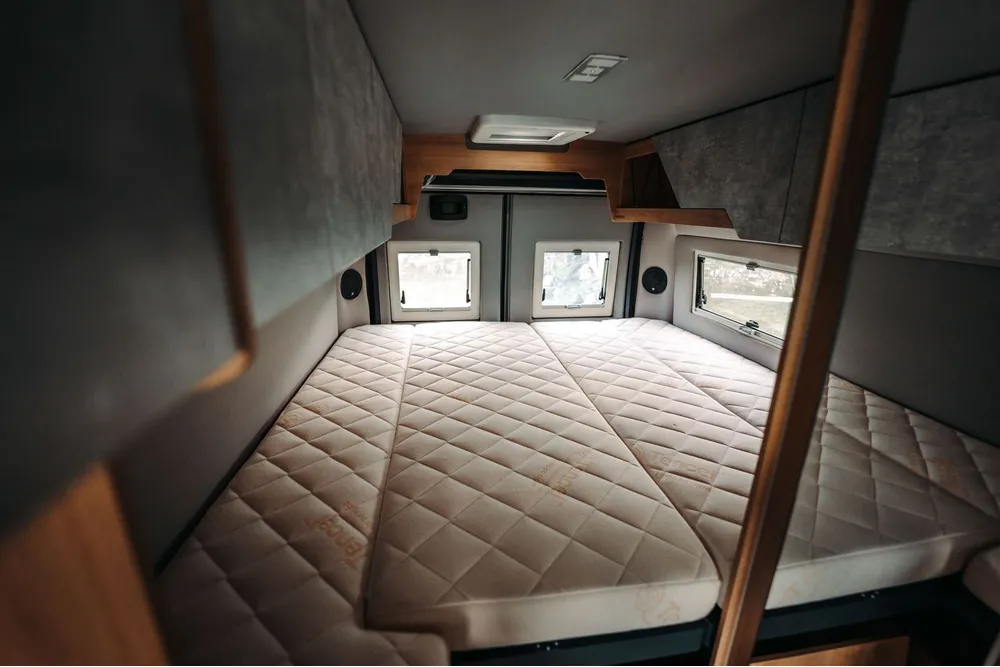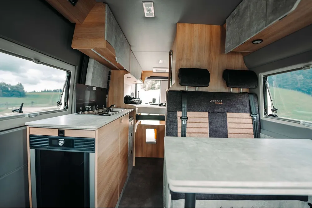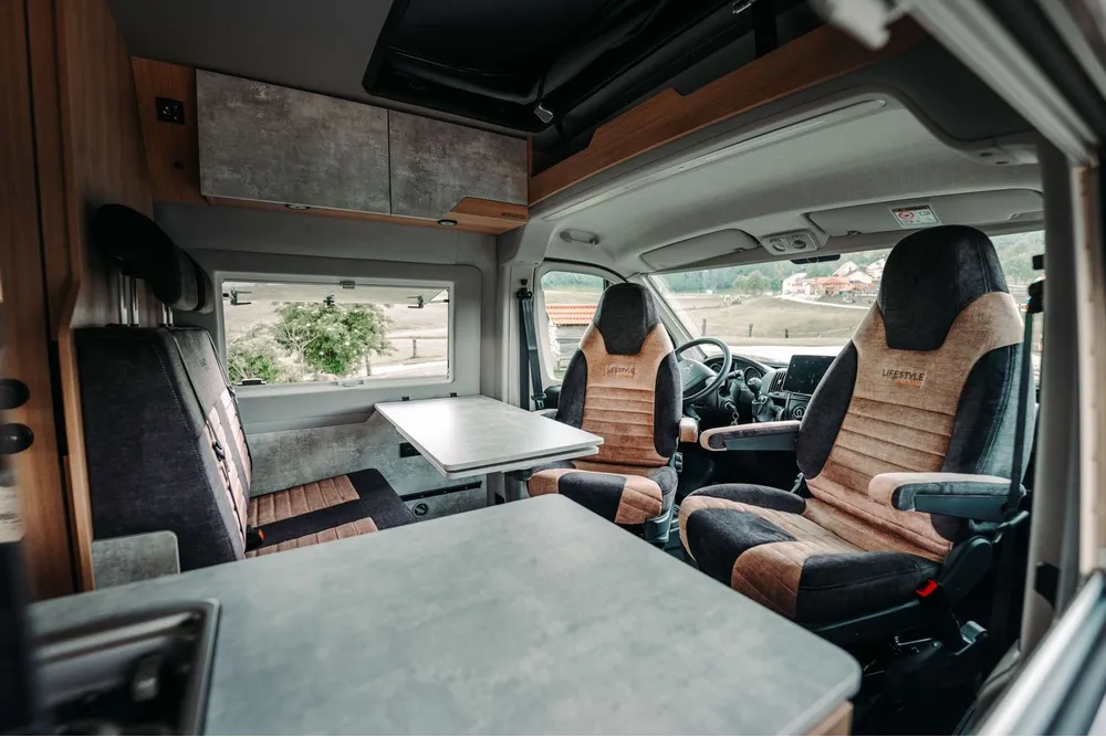 Die Polsterung des Wohnmobils besteht aus einem hochwertigen, plüschigen Veloursstoff in Grautönen. Die weiche Textur des Materials schafft eine einladende und gemütliche Atmosphäre, während die neutrale Farbpalette das Holzlaminatdesign des Wohnmobils ergänzt. Diese Kombination sorgt für einen harmonischen und komfortablen Lebensraum, perfekt für Entspannung und Abenteuer.
